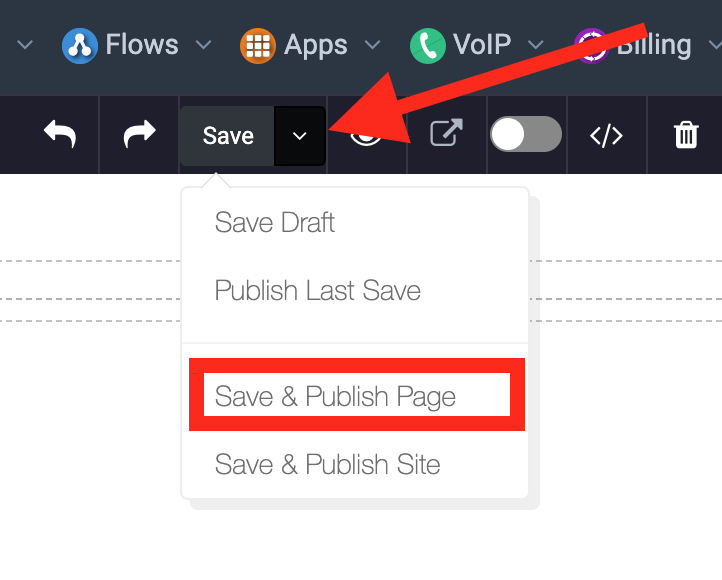 Now that your new domain is connected to FlowTrack, you need to go into the website designer and publish your website to this new domain. To do this in the web designer simply click the "Save" dropdown button and then select "Save & Publish Page"